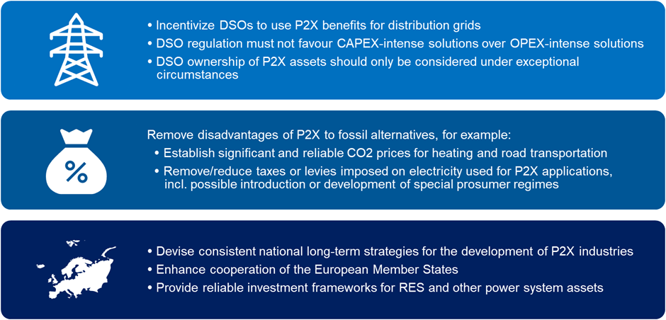 It is important to note that policy action must consider the existing energy sector framework: there are no one-size-fits-all solutions. Instead, it is necessary to make individual assessments of each case. The menu of possible solutions provided by PLANET can be regarded as a toolbox helping policymakers select the right options and thus significantly improve the conditions for P2X investments in their countries. Especially in countries with high ambitions for their intermittent renewables generation, governments would be well advised to prioritize reforms to keep pace with the rapid development of wind energy and PV plants.