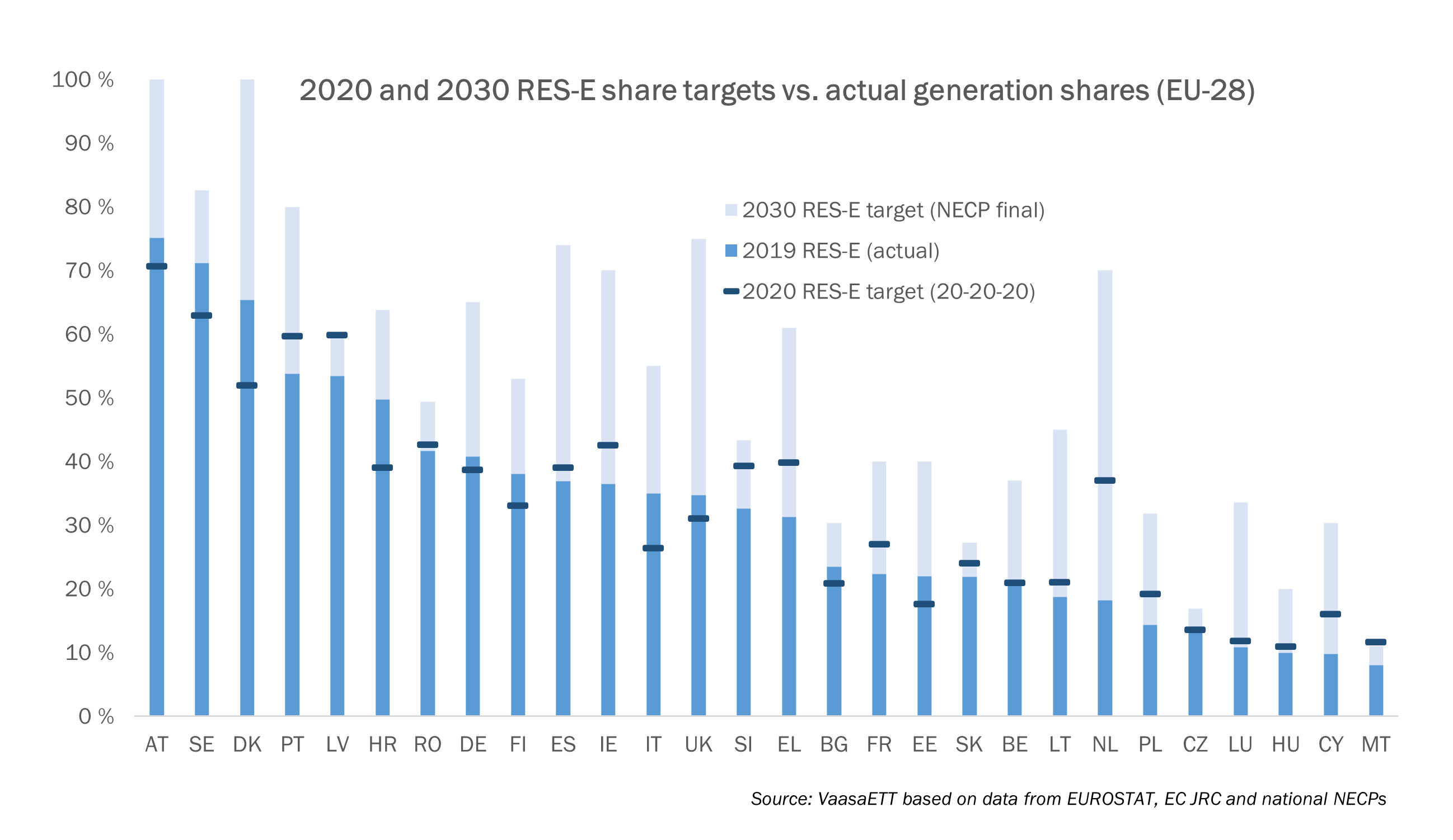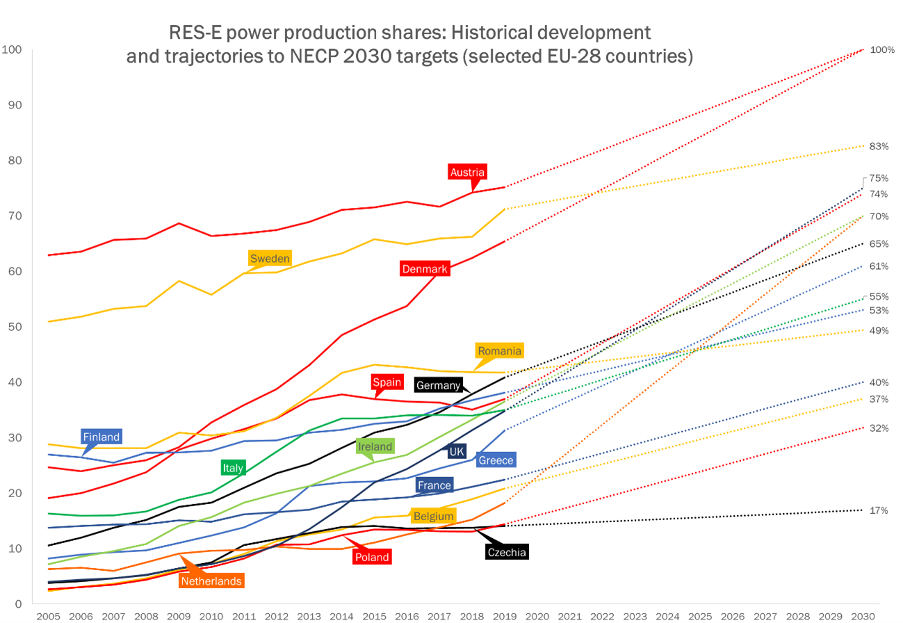 - the 2030 RES-E targets as defined in the NECPs (National Energy and Climate Plans, which had to be submitted to the EU in 2019)
