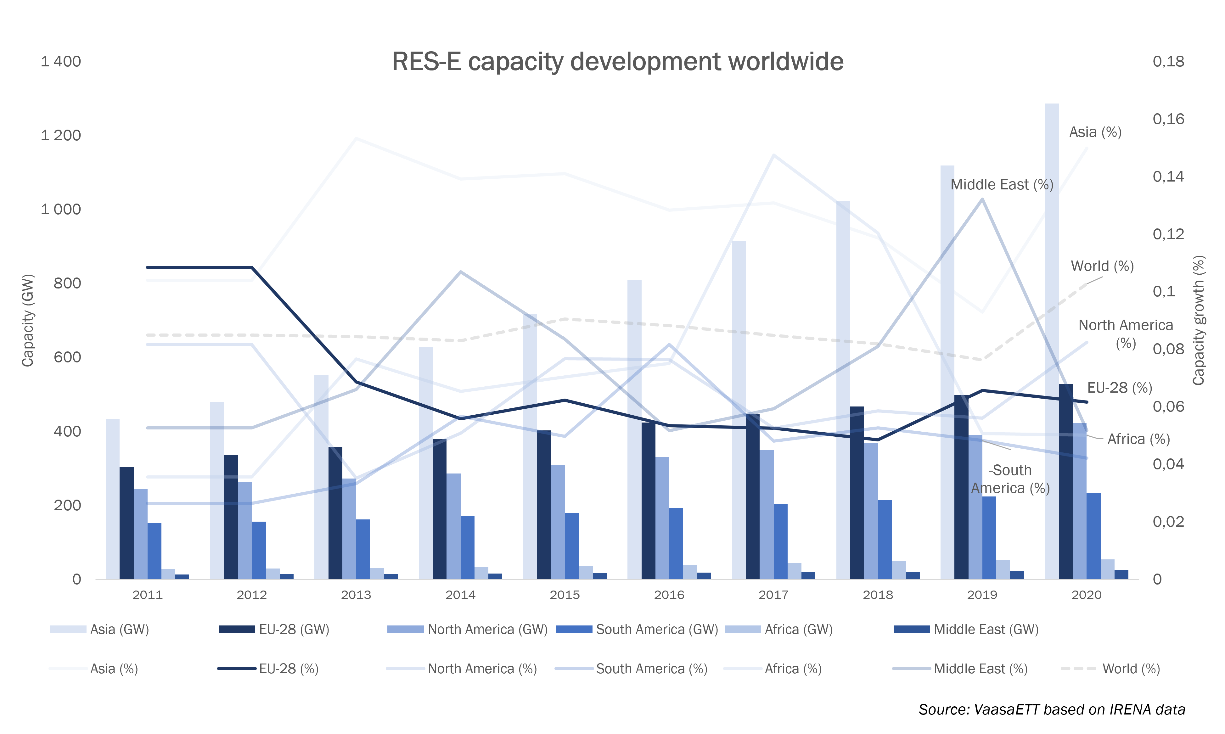 Looking at the EU as a whole, total RES-E capacity has been growing continuously over the past decade, as the following graph shows. Unlike in some other parts of the world, development has been fairly steady in recent years, with annual growth rates between 5% and 7% from 2013 to 2020.